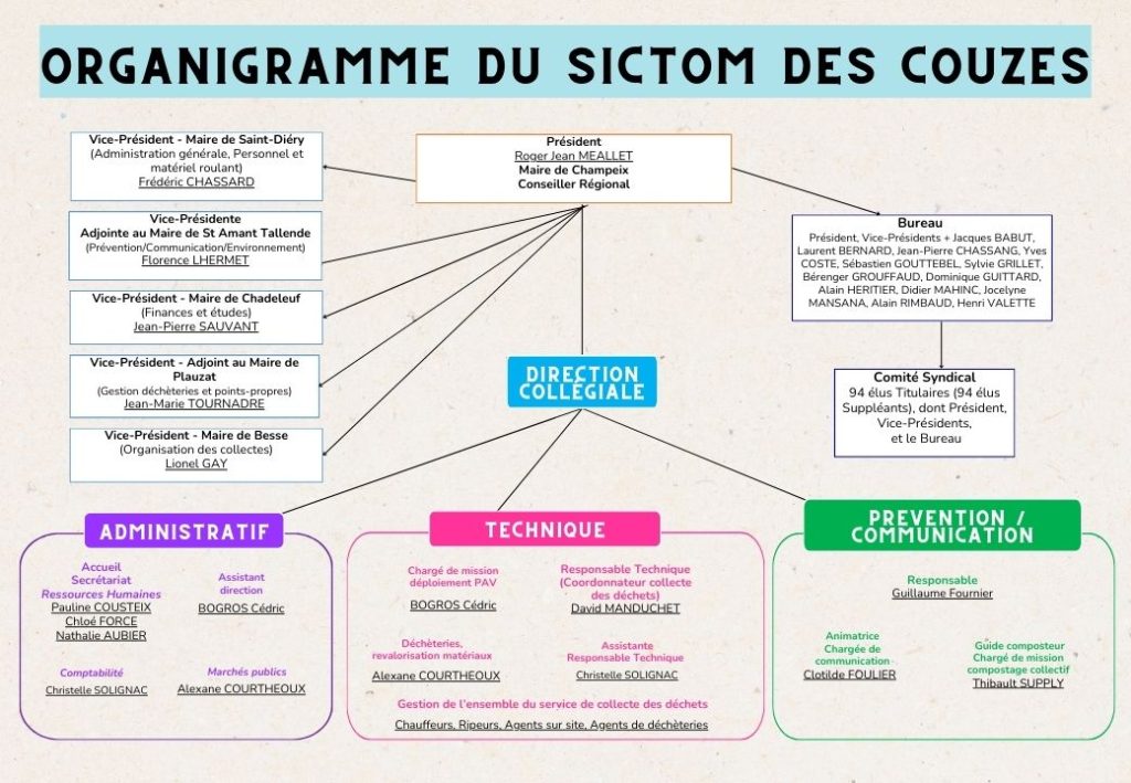 Le SICTOM des Couzes est également constitué d’un Bureau de 14 Elus et d’un Comité Syndical de 94 Elus, présidé par Monsieur Roger Jean MEALLET, qui valident et prennent les décisions lors d’Assemblées délibérantes.
